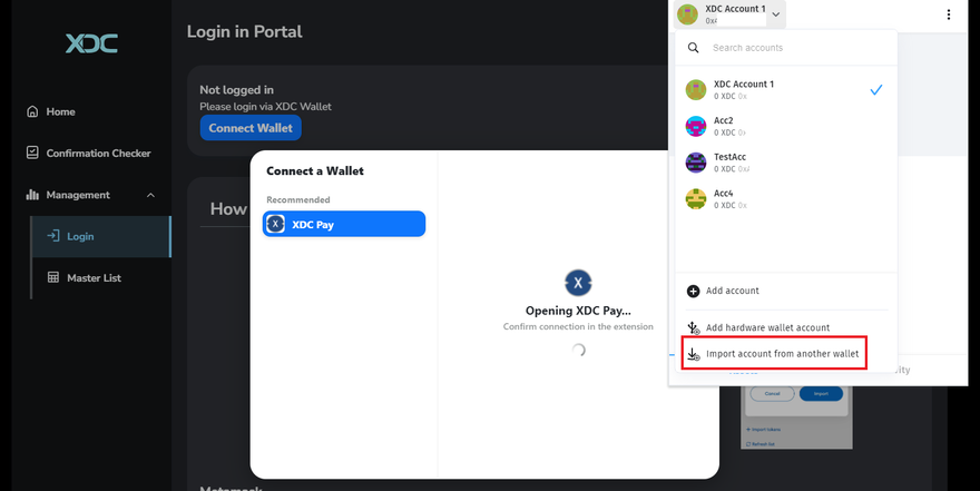 Step 4: Click account selector and "select Import account from another wallet", paste your "grandmaster Private Key"