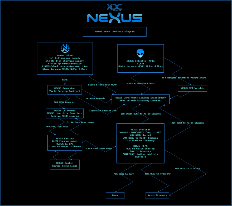 - Mints NEXU: Distributes NEXU to applicable LPs. -Superfarm: Can distribute a plethora of XRC-20 Superfarm rewards to different LPs.