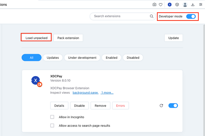 Now, ON the “Developer Mode” and click on the “Load Unpacked” option to import your XDCPay file. Select the unzipped file from the folder and upload it; after uploading the screen will look like this: