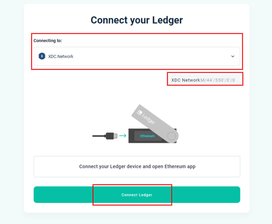 Step 6: Confirm the Network details and Click on "Connect ledger" button to connect your Ledger Device with the XDC Web Wallet.