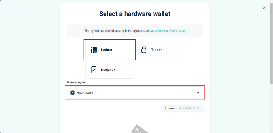 Step 5: Choose the Hardware "Ledger" and select the "XDC Network" from the dropdown.