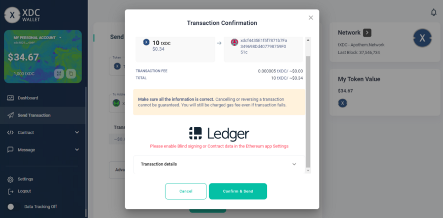 If “Blind signing or Contract data” in the XDC Network app settings is “Not enabled” then you will be notified like this: