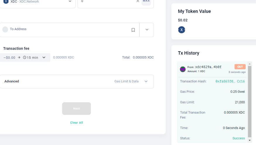 Step 11: For sending the XDC, Enter the XDC Amount, Address of the destination wallet address, and click on the Next button.