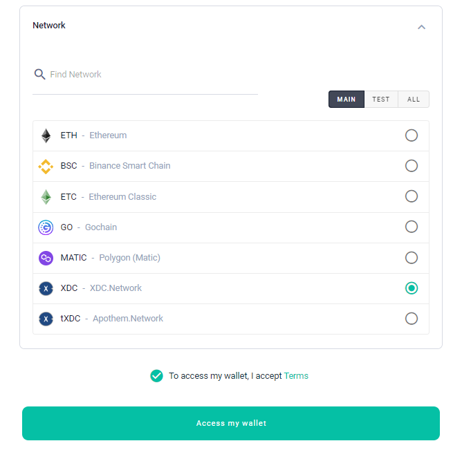 - Access the XDC Web Wallet and choose your Network.