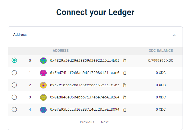 Step 8: Now connect your Ledger device by selecting any ONE address and Network i.e., “XDC Network” (Mainnet/Apothem Network), and click on the “Access my Wallet” button.