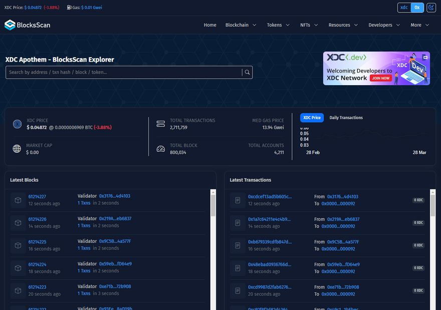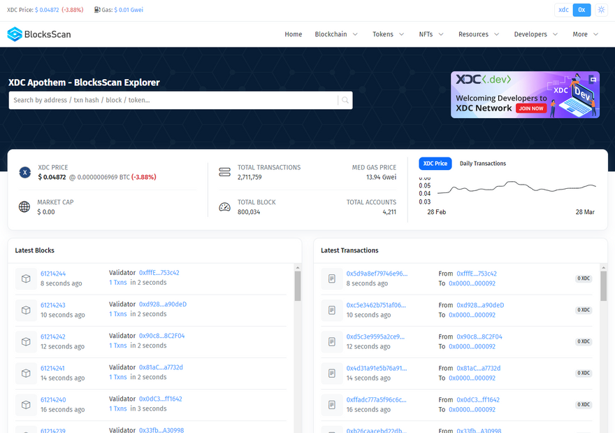 XDC Network - BlocksScan Explorer is a block explorer for transactions within the XDC Network ecosystem. Its user-friendly, detailed, and professional user interface makes it easy for anyone to explore transactions on XDC Network. XDC Explorer aims to bring the utmost transparency for the XDCChain.