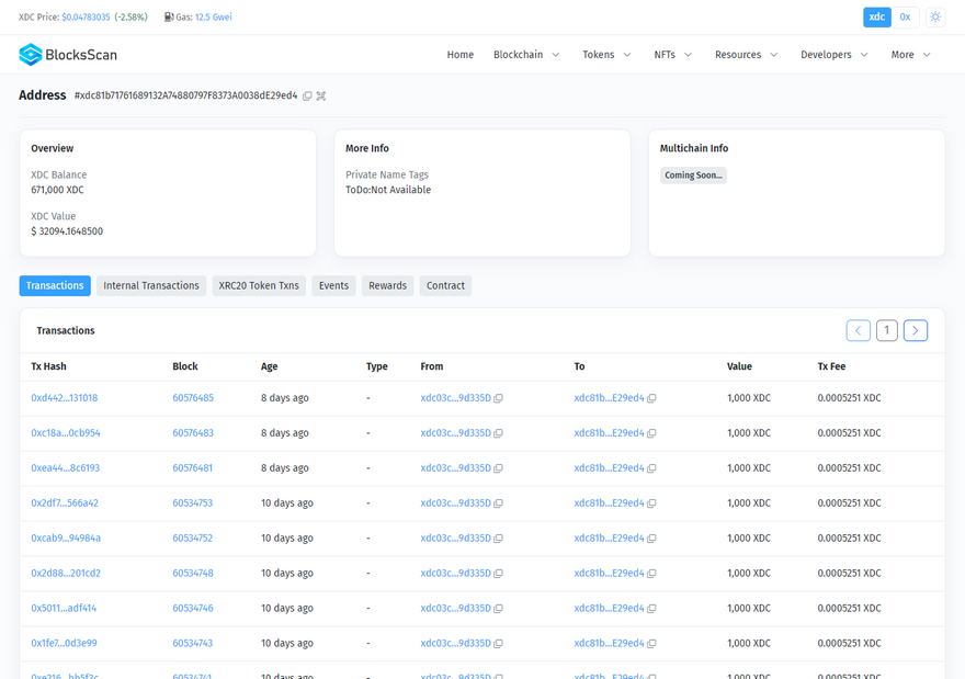 - XRC-20 Tokens Transferred: XRC20 token transactions with this address.