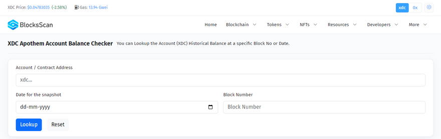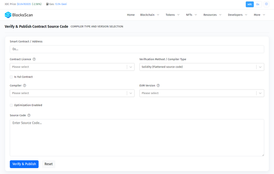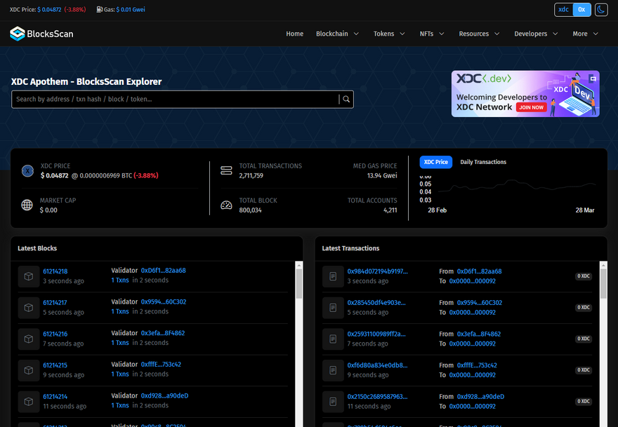 BlocksScan Explorer is a web-based tool that allows you to view & analyze data on various blockchain networks, and ecosystem support for EVM-Compatible Blockchain Networks, such as XDC Network. You can use BlocksScan Explorer to search for blocks, transactions, smart contracts, tokens, NFTs, and other information on the blockchain. BlocksScan Explorer also provides statistics, charts, and market data for the blockchain networks it supports.