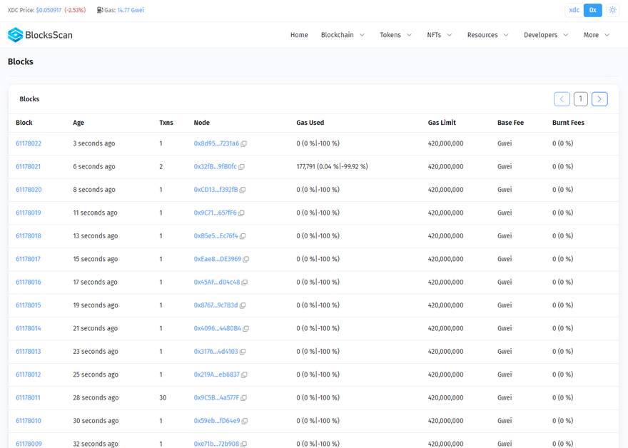 Blocks Page is a web page that displays the latest blocks on the XDC Network, a blockchain platform that supports smart contracts and decentralized applications. Each block contains a set of transactions that have been validated by the network nodes. Users can view the Block height, age, Number of transactions, Node address, and gas used for each block. They can also click on any block to see more details, such as the block hash, parent hash, nonce, difficulty, and transaction list. Blocks Page is part of BlocksScan, a block explorer and analytics platform for the XDC Network and other EVM-compatible networks.