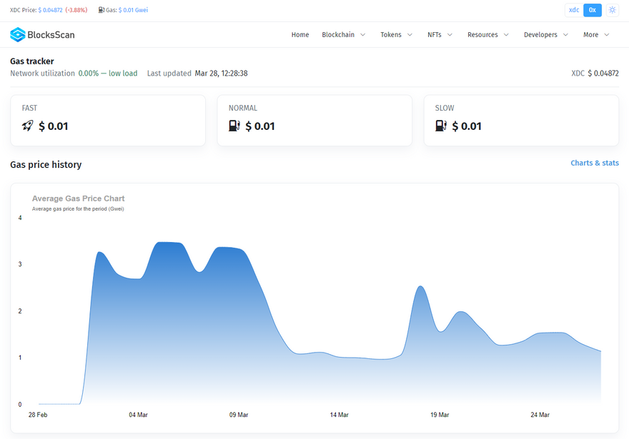 You can check the gas prices before starting a transaction via the XDC Gas Tracker feature. This tool accurately predicts the level of congestion or traffic on the network and estimates how much a transaction will cost.