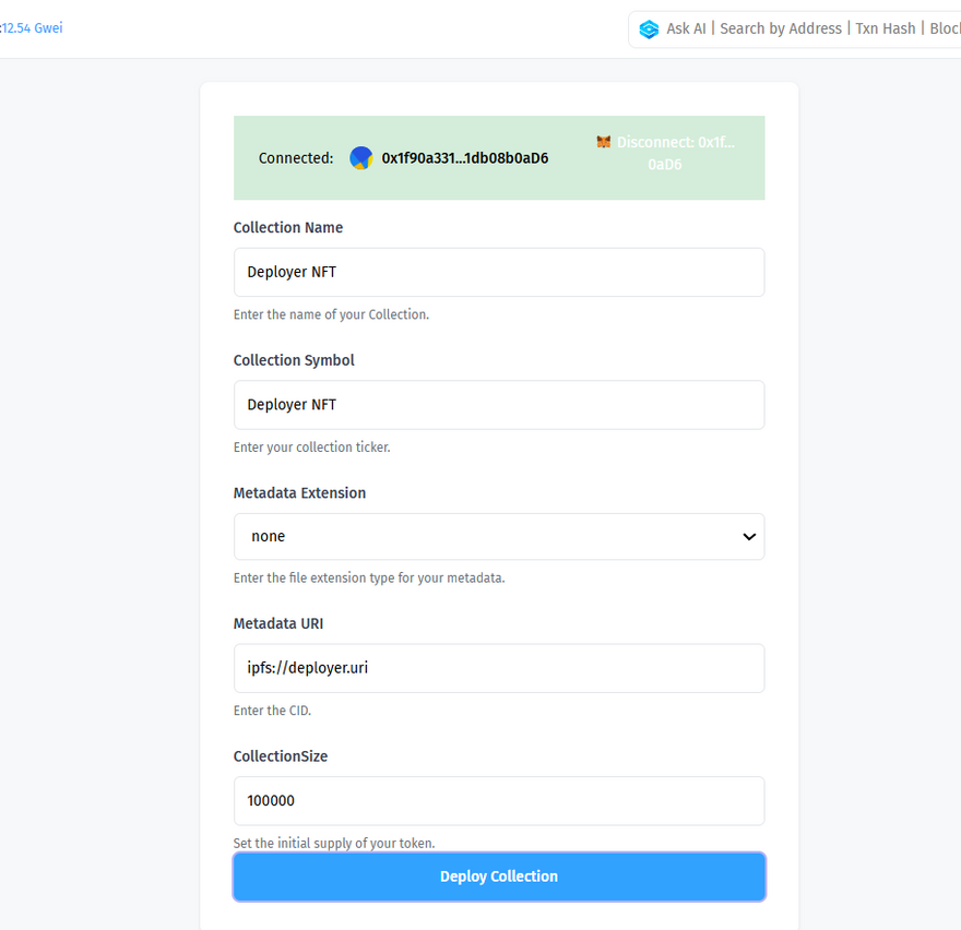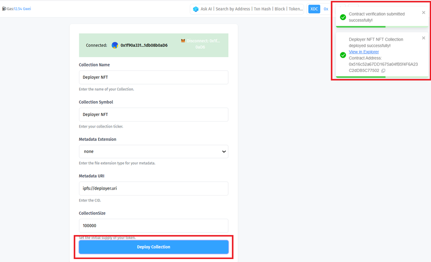 Similar to the XRC20 Token Deployer, the first step is to connect your cryptocurrency wallet. The deployer integrates with MetaMask, which provides the ability to interact with the blockchain and manage your NFTs. Connecting your wallet ensures that the NFT collection is deployed from your address, giving you full control over it.