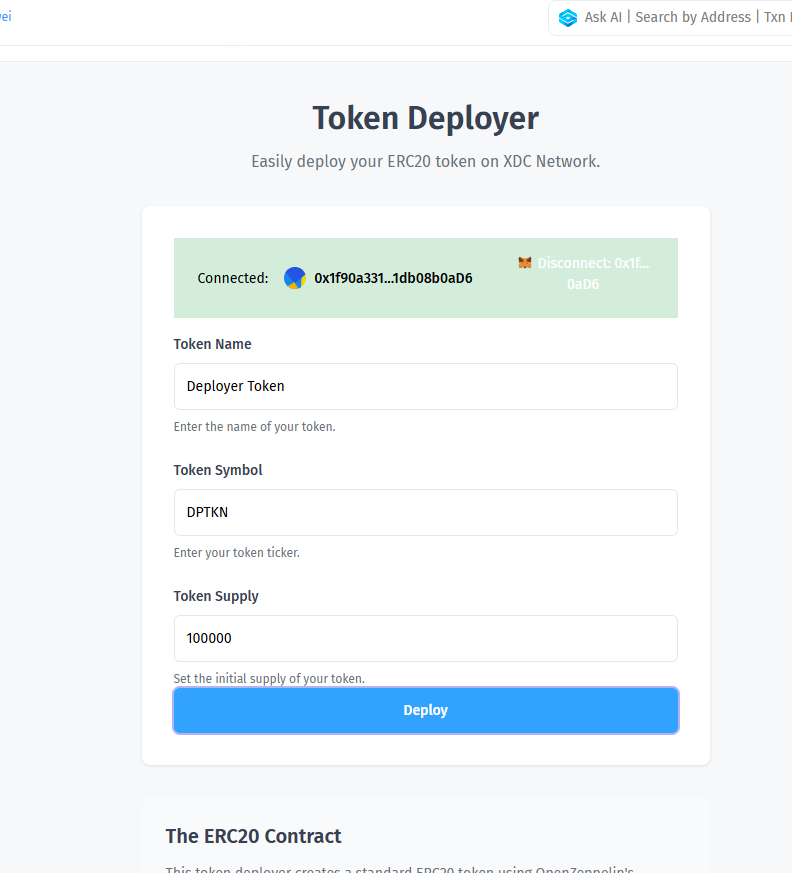The XRC20 Token Deployer is an intuitive tool that allows anyone to create and launch their own XRC20 tokens on blockchain networks, such as XDC. The deployer streamlines the process, removing the need for technical expertise. Here’s how you can use it to deploy your XRC20 token.