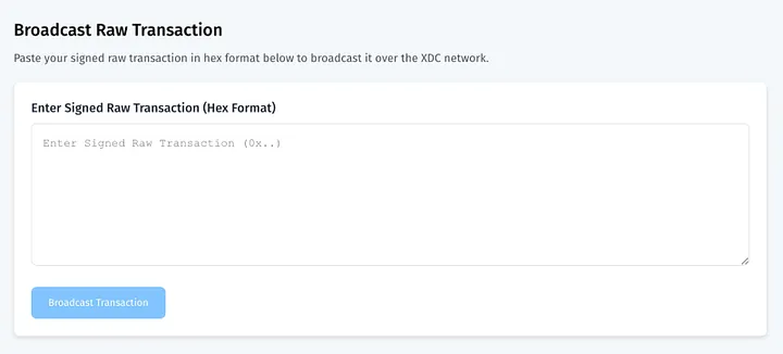 Developers often need to broadcast signed transactions directly to the blockchain. XDCScan provides an easy-to-use PushTx feature for this purpose.