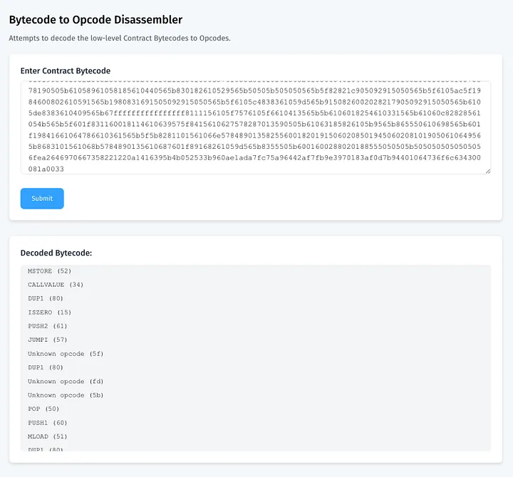 Note: Review the results. The tool will decode the bytecode and display the corresponding opcodes, giving you a detailed breakdown of the low-level instructions.
