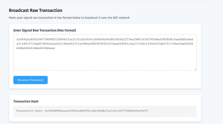 Step 4: Once submitted, the transaction will be broadcasted to the blockchain, and the transaction hash will appear below as confirmation.