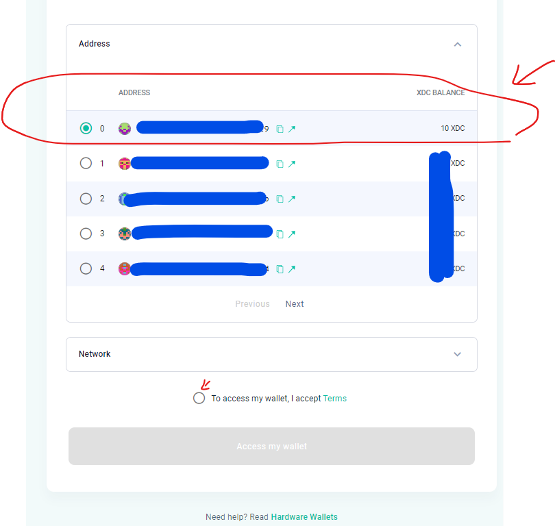 Select the address you wanna send or recive, Tick Accept Terms and Accsess Wallet ( if you are sending XDC to your wallet first time every Wallet address will show 0 )