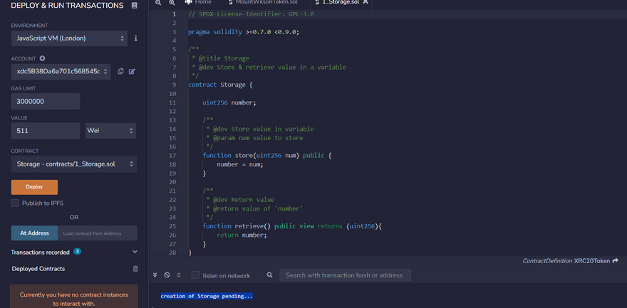 I am a new/student developer and trying to deploy my first time to xdc network. Im not able to actually deploy the basic test smart contract. After compiling a standard ‘storage’ contract and deploy it with gaslimit set to:3000000 and wei 1,10,100,1000 no amount works because what happens instead message: creation of storage pending.