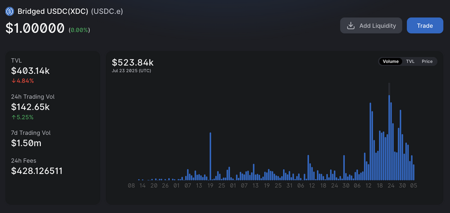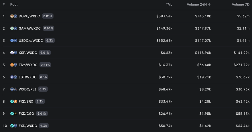 Again, the USDC.e/WXDC pool deserves special attention — it's consistently active, and its 0.3% fee structure makes it an attractive option for liquidity providers.