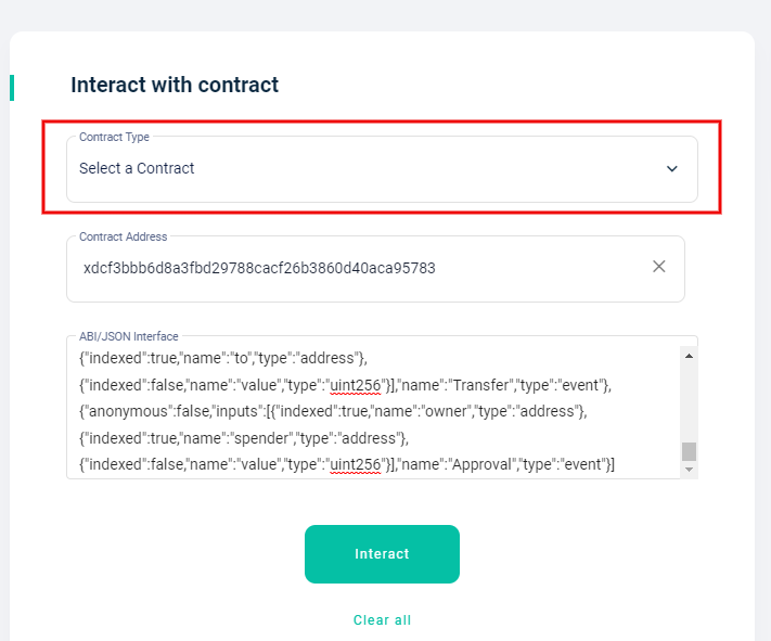 While Interacting with contract, instead of selecting anything keep as it is, just enter the Contract Address, ABI for that contract and click on Interact button to interact with the Contract.