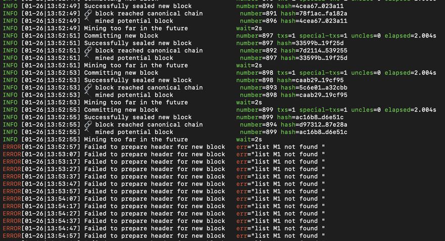 After setting up the nodes as per the link mentioned above, the node starts mining untill it touches block number 899 and then it errors out(with error message "list M1 not found").