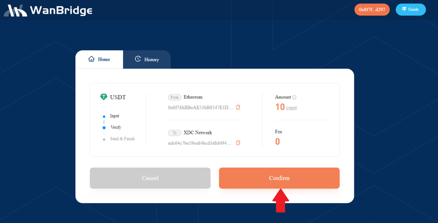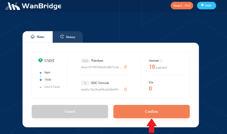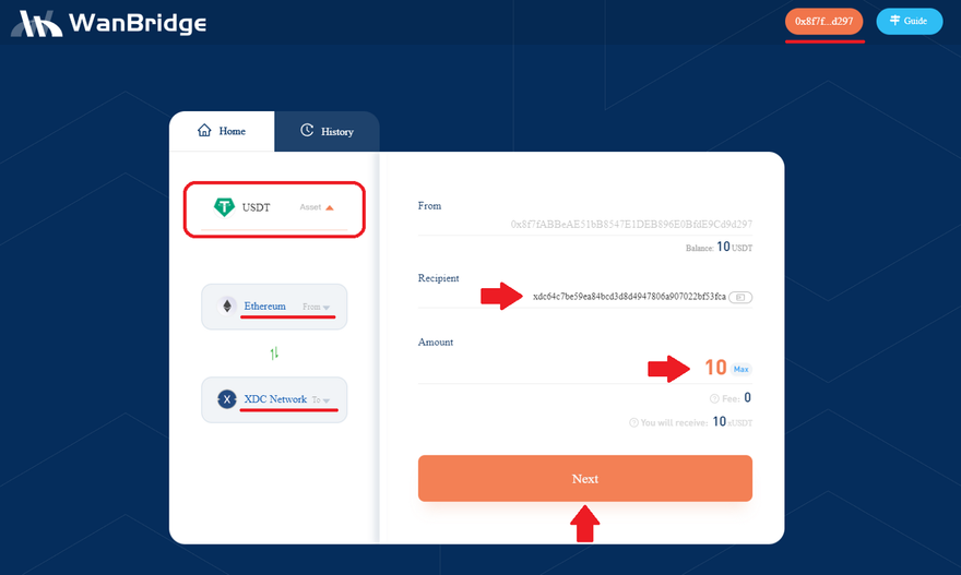 Select “USDT” from the drop-down menu, then select “From: Wanchain” and “To: XDC Network”. Enter your destination address in the Recipient field (Your XinFin address) and the amount you wish to crosschain convert, then click “Next”.