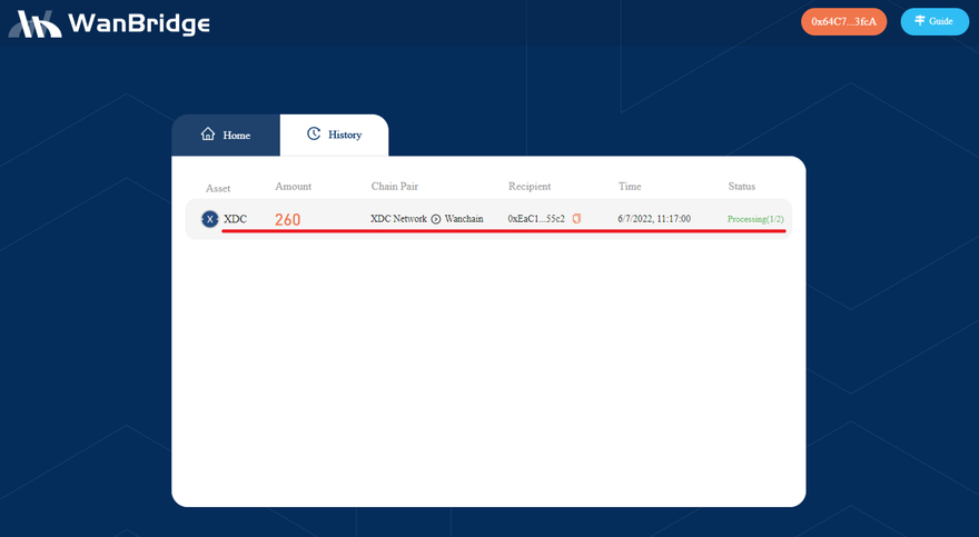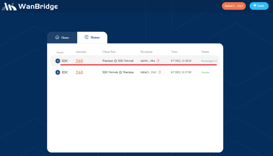 Your XDC crosschain transaction will now begin processing, wait for it to show “Success”.
