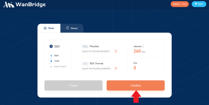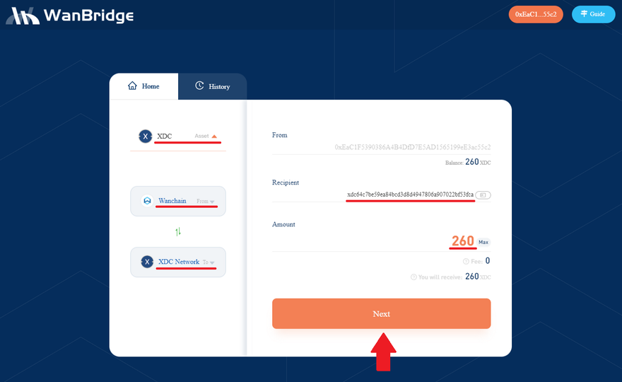 Select “XDC” from the drop-down menu, then select “From: XDC Network” and “To: Wanchain”. Enter your destination address in the Recipient field (Your Wanchain address) and the amount you wish to crosschain convert, then click “Next”.