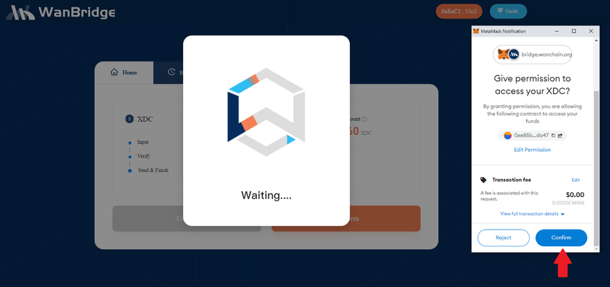 Confirm the XDC Pay extension pop-ups (Click Submit)