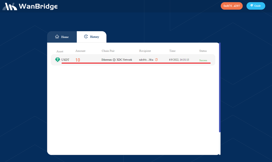 Wait for your transaction to show “Success”, then check your XinFin wallet address for your USDT.