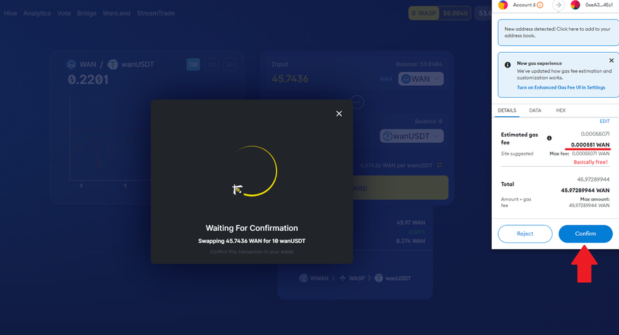 Confirm the MetaMask pop-ups, there will be two if this is your first time swapping on WanSwap.