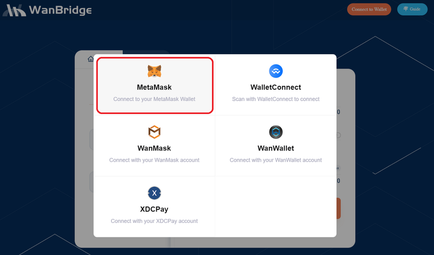 Head over to WanBridge Web, then click “Connect to Wallet”, then click on “MetaMask”.