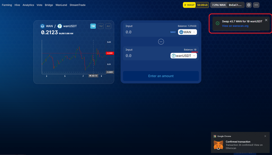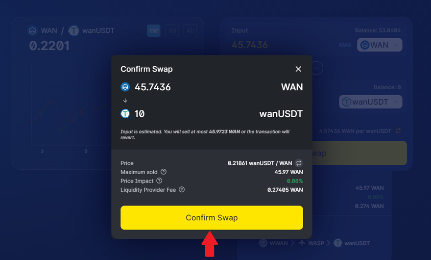 From the drop-down menu, select wanUSDT then enter the amount you wish to swap (in our case, we are swapping ~45 Wan for 10 wanUSDT). Finally, click “Swap” to continue.
