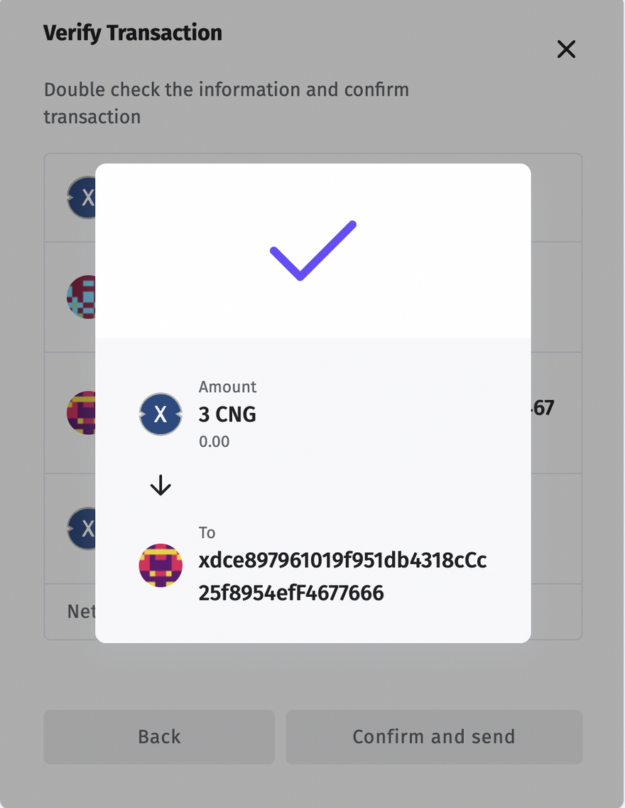2) Once you click on send option, below screen will appear where it will ask to enter the wallet address where you wish to transfer the XRC20 tokens, Hover on the dropdown to select the token and enter the amount.