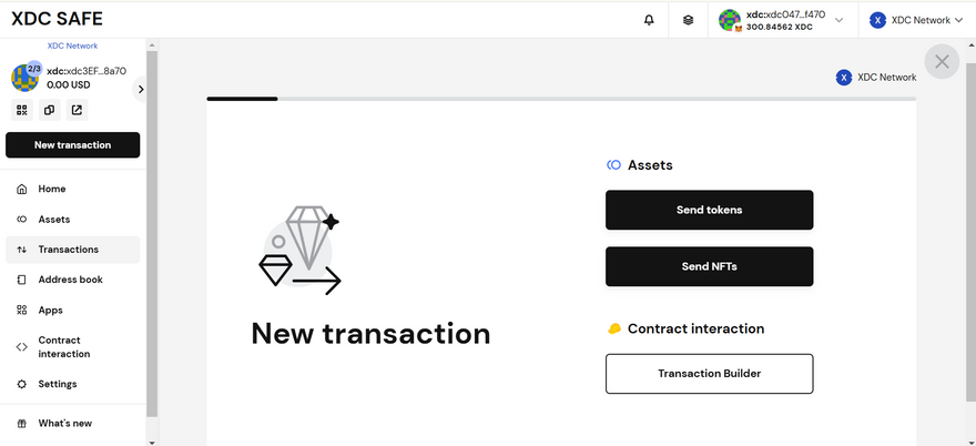 - Navigate to the New Transaction section in XDC Safe and select Transaction Builder.