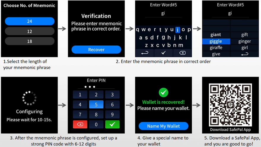 The following pictures show the step-by-step process of recovering an existing wallet on the S1 hardware device: