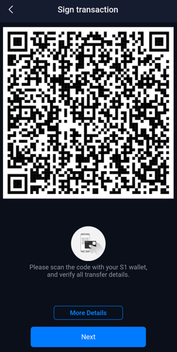 By singing the transfer on the S1 device, you will see a set of dynamic QR codes shown on the S1 device. On the SafePal App, click ‘Next’ to open the cellphone camera.