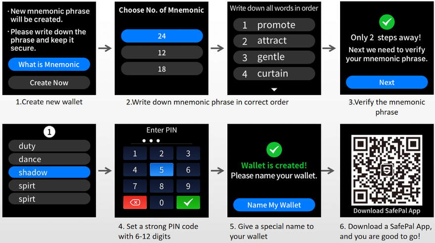 The following pictures show the step-by-step process of creating a new wallet on the S1 hardware device: