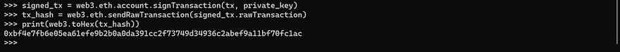 This sends the raw transaction to the network and return a transaction hash. We can convert the transaction hash to hex and print it to the terminal with print(web3.toHex(tx_hash)).