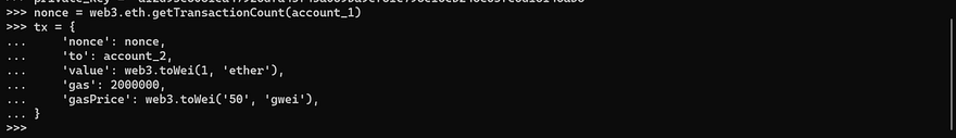Now let’s build the XDC Network transaction that sends XDC, XDC cryptocurrency, form account_1 to account_2. We can build the transaction dictionary that will get broadcast to the blockchain like this: