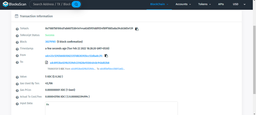 Here is the contract address xdc8953Be029b3539D4331628E93064640C94Bd02B8 let’s send some XDC tokens to the contract address from another random address to get the XFM tokens