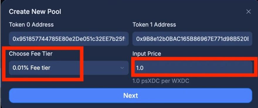 - Set the Initial Price: When creating a new pool, you must set the initial price of Token0 in terms of Token1. Essentially, what is 1 psXDC worth in WXDC at launch? Since psXDC is meant to equal XDC, the price should be 1.0 (1 psXDC = 1 XDC). Enter 1.0000 as the initial price. Double-check that you didn't mix up token order: if you accidentally put psXDC as Token0 and WXDC as Token1 (or vice versa), adjust the price accordingly (it should still equate to 1:1). In our example, if Token0 = WXDC and Token1 = psXDC, you’d also set 1 WXDC = 1 psXDC, which is still 1.0. The goal is to reflect parity.
