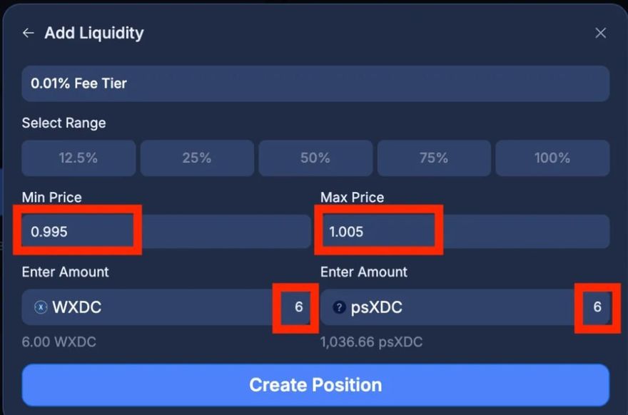 For psXDC/WXDC, you can choose a very tight range around 1.0, because the expectation is the price will hover extremely close to 1. (Any significant divergence would be arbitraged or indicate something is off with the peg). A narrow range lets you concentrate liquidity and earn more fees since the price shouldn’t stray much. The guide suggests a range like 0.995 to 1.005 for min/max price, which is a ±0.5% band around 1.0. This is quite tight (perhaps corresponding to the 1% preset range in the UI). You can certainly go a bit wider if you want more cushion (e.g. 0.99 to 1.01 for ±1%, or even wider). But even if the price of psXDC relative to XDC does move slightly (due to small market fluctuations or unclaimed staking rewards accruing), it's likely to stay very close to 1. A tighter range means nearly all your liquidity is always active in the small band where trades occur, maximizing fee generation.