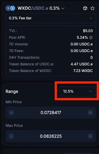 Tip: For volatile pairs like XDC vs USD, it’s often wise to choose a moderately wide range to avoid constant maintenance. The guide from the XDC community suggests around a ±12.5% range for the WXDC/USDC.e pool. This means the pool would remain active even if XDC’s price swings 12.5% up or down against USD before you’d need to adjust. A 25% or 50% range would be even safer (less frequent adjustments) but with more diluted earnings. If you are comfortable monitoring and adjusting your position frequently, you could go narrower for higher fee returns. Otherwise, 10–15% is a balanced choice for beginners.