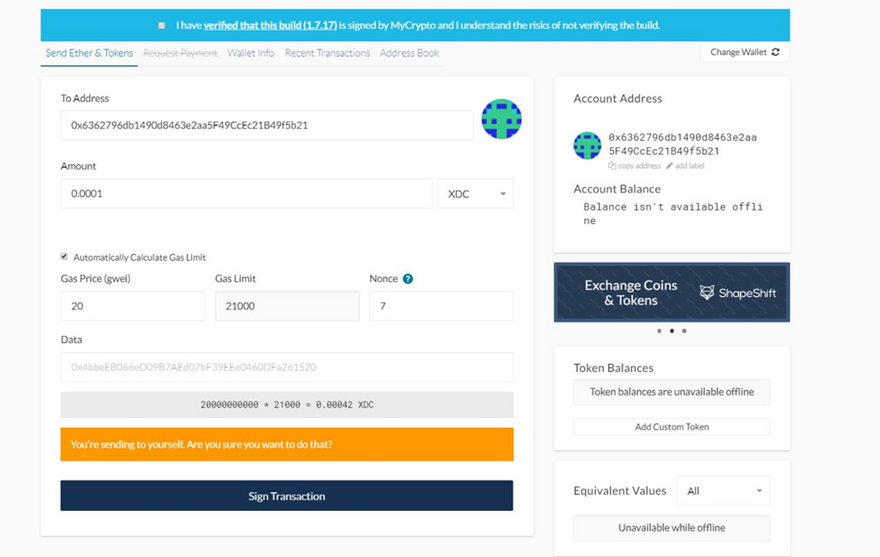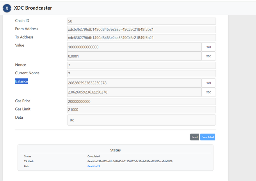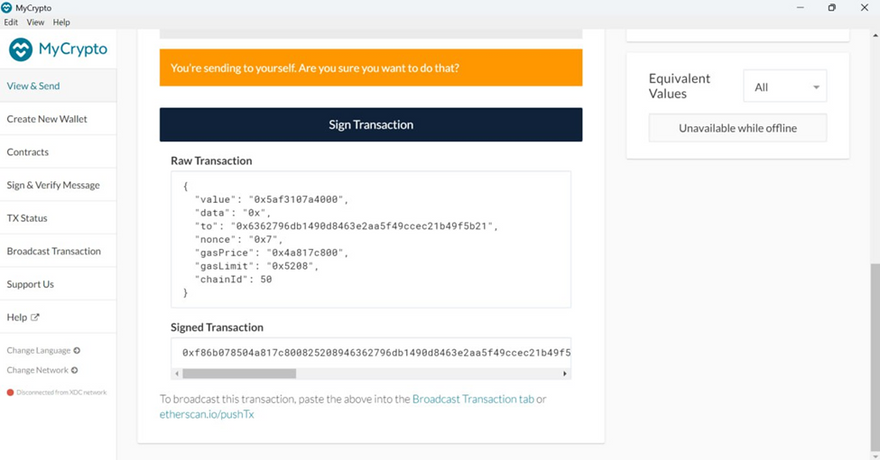 By following this guide, you have successfully executed an offline transaction on the XDC Network using MyCrypto. This method ensures maximum security by keeping your private key isolated from the internet while allowing transactions to be signed and broadcasted securely. Always ensure you store your private key and Keystore file safely and verify all transaction details before broadcasting.