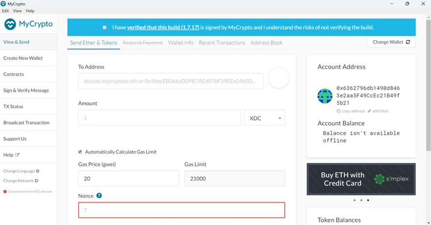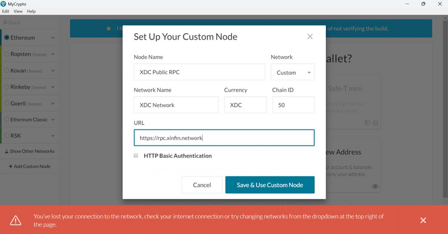 ○ Click Save. XDC Network is now added to MyCrypto.