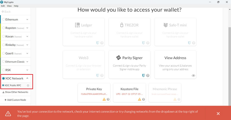 Choose "Keystore File" (MyCrypto only supports Keystore for XDC Network).