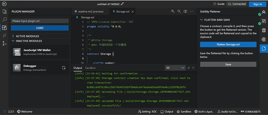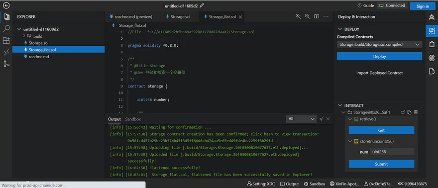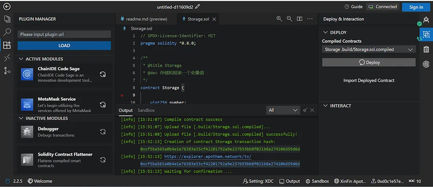 Navigate to the “Deploy & Interaction” module, choose the smart contract you want to deploy among the compiled smart contracts, and click the “deploy” button. For this tutorial, the Storage smart contract will be deployed. Here is the tx hash for the smart contract https://explorer.apothem.network/tx/0xcf5ba565a0b4e1e76383e33cf42201792a9e237693bb8f021b8a274106d59d6d#overview