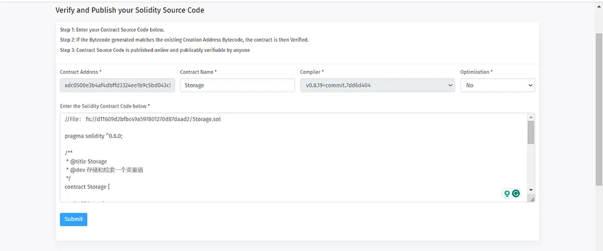 After entering the compiler version and selecting the compiler type, paste Storage_falt.sol and click submit.