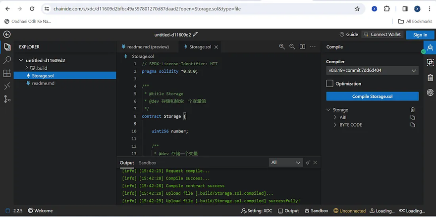 After successful compilation, it’s time to deploy your compiled storage smart contract to the XDC Apothem Test Network. For that, you need to have a MetaMask installed, the XDC Apothem Test Network added to your wallet, and some testnet tokens to pay the transaction fee.