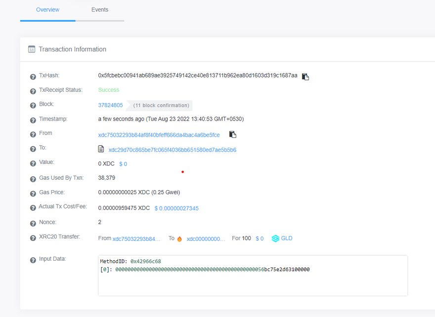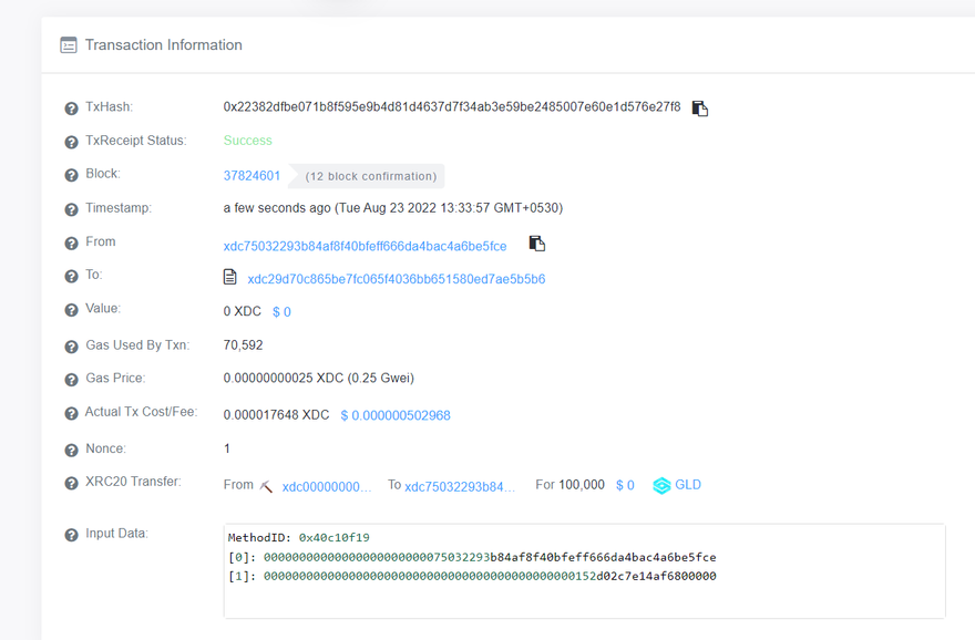 Notice in particular the last line where you see an address of xdc000000…. This address (abbreviated as xdc00) is known as the null address. When you mint your token, this null address will be used as the origin account where tokens will be transferred to the token owner.